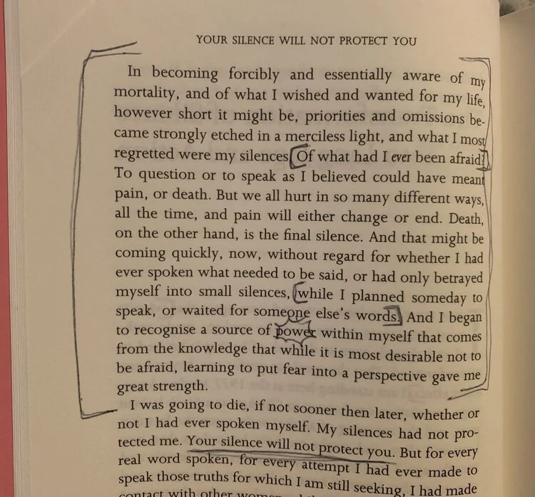 “In becoming forcibly and essentially aware of my mortality, and of what I wished and wanted for my life, however short it might be, priorities and omissions became strongly etched in a merciless light, and what I most regretted were my silences. Of what had I ever been afraid? To question or to speak as I believed could have meant pain, or death. But we all hurt in so many different ways, all the time, and pain will either change or end. Death, on the other had, is the final silence. And that might be coming quickly, now, without regard for whether I had ever spoken what needed to be said, or had only betrayed myself into small silences, while I planned someday to speak, or waited for someone else’s words. And I began to recognize a source of power within myself that comes from the knowledge that while it is most desirable not to be afraid, learning to put fear into perspective gave me great strength.”